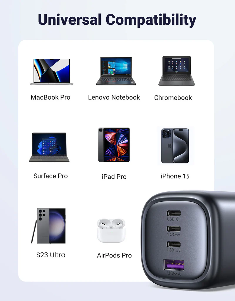- Q: Why is it smaller than my old 100W charger? A: It uses GaN (Gallium Nitride) technology, which allows components to be packed closer together with better heat dissipation than older silicon-based chargers.